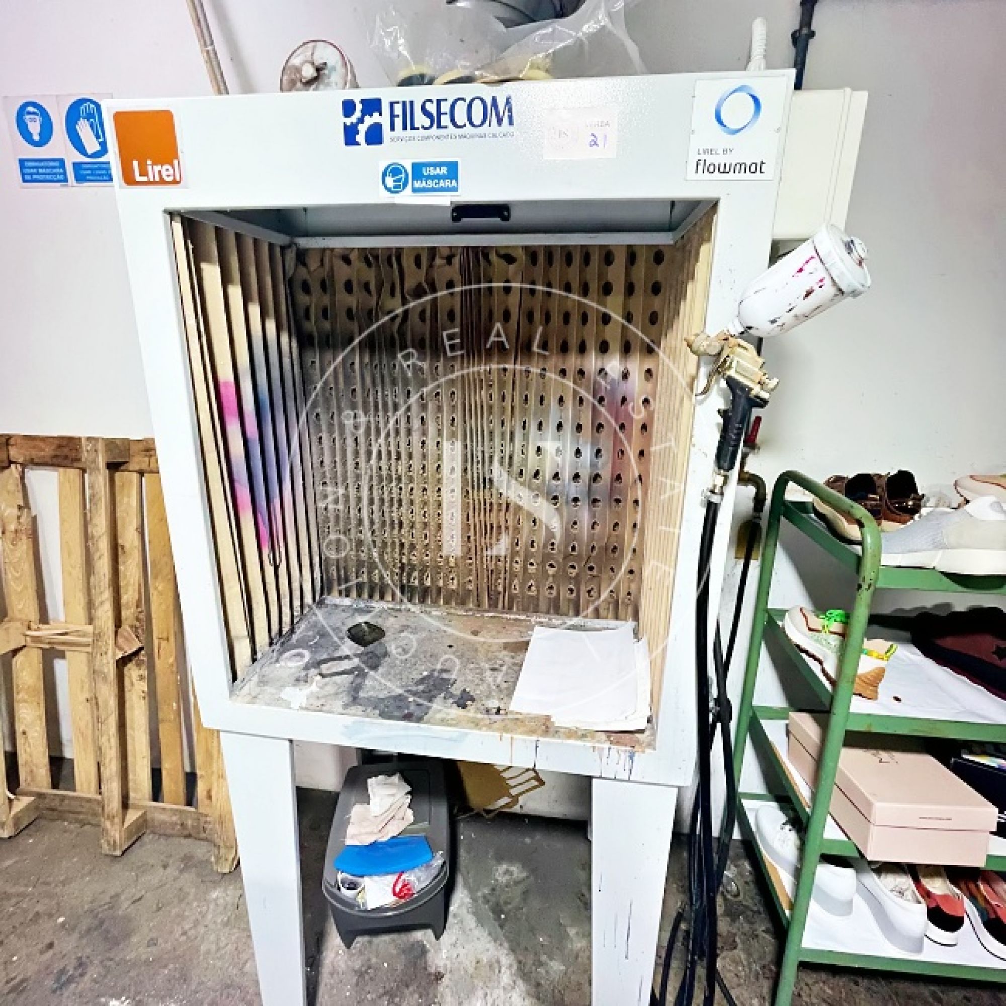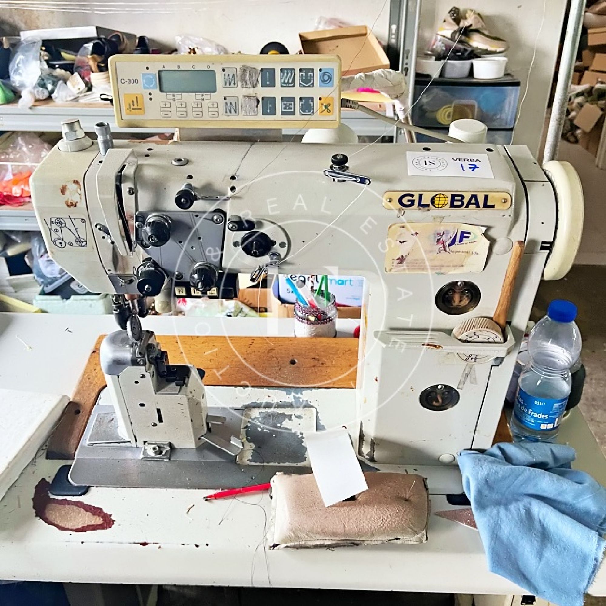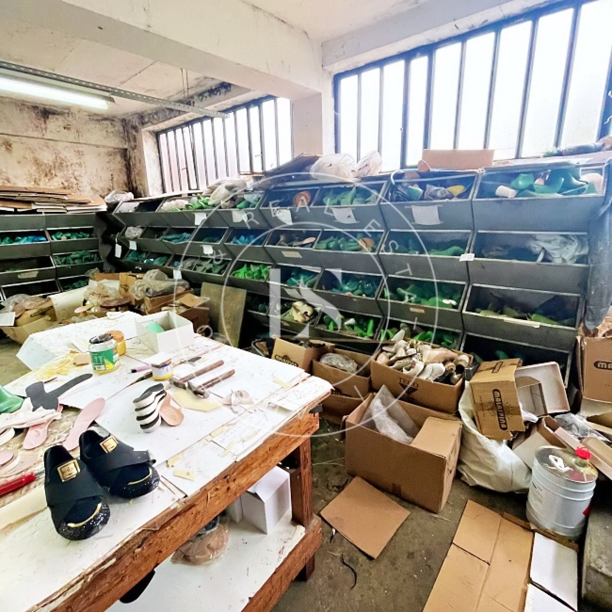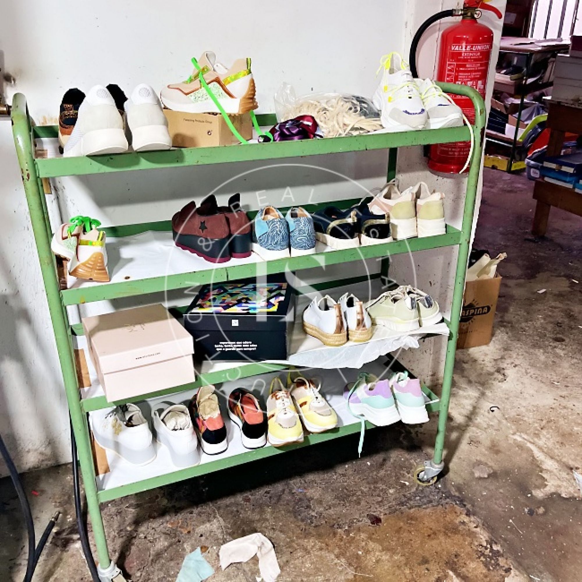 1 computador “LG”, 1 monitor “ASUS”, 3 secretárias, 3 impressoras, lote de calçado diverso (exposição e amostras), 2 mesas de corte, 2 cavaletes, balancé “G999” com cortantes, 5 mesas de trabalho, 14 estantes metálicas, 2 armários metálicos, lote de matérias-primas (peles, sintéticos, solas), máquina de facear “Sagitta”, máquina de timbrar palmilhas, máquina de meter ilhós “AJRA”, máquina de costura “Joyee” JY-Z930, máquina de aplicação manual de ribetes, máquina de colar entre telas, máquinas de costura “Global” (incluindo modelo C-300), 4 carrinhos de transporte metálicos, máquina de canos, máquina de limpar solas, máquina de acabamento “Filsecom”, máquina de moldar contrafortes “Norba” N89CF, máquina de rebaixar, máquina de passar cola, máquina de colar testeiras “Bimatronic”, lote de formeiros com prateleiras, máquina de pregar biqueiras “K78 Cerim”, 2 fornos de aquecer gáspeas (1 “Eletrotecnica”), 2 máquinas de tirar formas, máquina de pregar calquinheiras “K58 Cerim”, máquina lixadeira/fresadeira, máquina de apertar solas, linha transportadora com 28 carros, prensa pneumática “Lima Miver” LM 200, máquina de aquecer solas, máquina escovadeira, máquina sopradora de calor, máquina de pregar saltos “Brustia”, máquina de agrafar, máquina de aplicar adesivo “Flowmat”, máquina de costura “Pfaff” e máquina de facear “Fortuna”.
